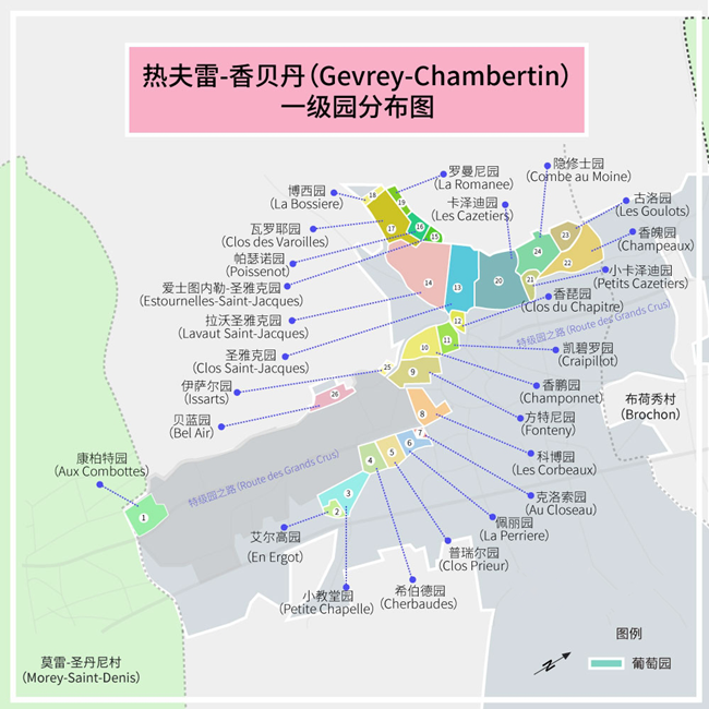 此外,勃艮第還有數(shù)個(gè)大大小小的村莊,不同村莊衍生出了不同的法定產(chǎn)區(qū),各個(gè)村莊獨(dú)特的風(fēng)土也為這些村莊刻上不同標(biāo)簽。比如,提到熱夫雷-香貝丹(Gevrey-Chambertin),就會(huì)讓人想到強(qiáng)勁、飽滿(mǎn)、豐富和堅(jiān)實(shí)的結(jié)構(gòu),以及極強(qiáng)的陳年能力。提到香波-慕西尼(Chambolle-Musigny)就讓人想到優(yōu)雅與精致。
