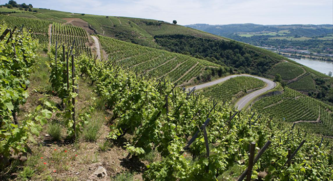 在北羅納河谷(Northern Rhone Valley),獨(dú)特的地形和氣候條件鑄就了風(fēng)格極為強(qiáng)勁的西拉葡萄酒。這里緯度較高,且常年有密斯托拉風(fēng)(Mistral)吹拂,氣候十分涼爽,是西拉葡萄可以達(dá)到完全成熟的臨界環(huán)境。正是在這樣的環(huán)境下,西拉的品種魅力被完全激發(fā)出來(lái)。葡萄園大多坐落在東西走向的山谷地帶,以降低從北方吹來(lái)的密斯托拉風(fēng)的影響,且多分布于朝南向的陡峭山坡上,有利于葡萄樹(shù)接收充足的陽(yáng)光和熱量。