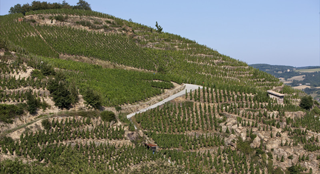 在北羅納河谷葡萄園,河流流經(jīng)之處多為狹窄的峽谷和陡峭的山坡,因此葡萄園也更多地種植在靠近河流的陡坡上。由于離海洋較遠(yuǎn),北羅納河谷葡萄園以大陸性氣候?yàn)橹鳎侄喽嗌偕贂?huì)受到地中海(Mediterranean)氣候的影響,夏季炎熱干燥,冬季寒冷少雨。這里的土壤以礫石、頁巖和石灰?guī)r為主,排水性能優(yōu)越。這樣一來,種植在山坡上的葡萄藤可以更好地接收生長季充足的陽光,再加上排水性良好的土壤,有助于葡萄果實(shí)更好地成熟。北羅納河谷葡萄園著名的子產(chǎn)區(qū)羅第丘(Cote Rotie)的產(chǎn)區(qū)名在法語中意為“被炙烤的山坡”,就很形象地描繪了這一風(fēng)土特點(diǎn)。