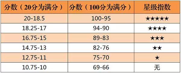 英國的《醇鑒》(Decanter,簡稱 DE)雜志始創(chuàng)于 1975 年,是一本專門介紹世界葡萄酒及烈酒的專業(yè)雜志。由于英國幾乎不生產(chǎn)葡萄酒,加上其王室在歐洲的崇高地位,大眾普遍認為英國對葡萄酒的評分會更客觀公正,因此《醇鑒》雜志在英語國家有著很大的影響力。該雜志評分采用 20 分制,0.25 分為最小單位,提供百分制換算,同時有從 0 星級到 5 星級的推薦規(guī)范: