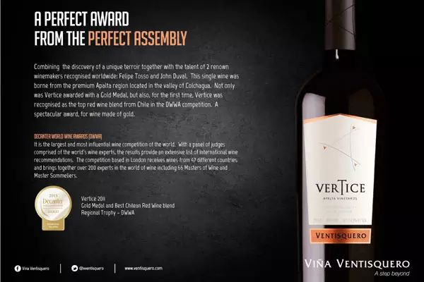 另外,該雜志還舉辦了極具影響力的醇鑒葡萄酒國際大獎賽(Decanter World Wine Awards,簡稱 DWWA)。該賽事始于 2004 年,一直是歐洲最杰出的葡萄酒競賽之一。同《醇鑒》評分體系一樣,該大賽也是采取 20 分滿分制,14.5 分以下沒有獎項,14.5-15.4 分為推薦獎,15.5-16.9 分為銅獎,17-18.4 分為銀獎,18.5 分以上是金獎。除此之外,大賽還設(shè)置了地區(qū)獎(Regioal Trophy)和國際獎(International Trophy)。如冰川酒莊神曲紅葡萄酒 2011 年份(Ventisquero Vertice Carmenere/ Syrah)就獲得了 DWWA 的地區(qū)金獎。