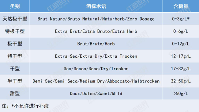 需要注意的是,天然極干型起泡酒是不允許使用含糖的調(diào)味液進(jìn)行補液的,表中0-3g/L的含糖量指的是二次發(fā)酵后酒中殘?zhí)堑暮糠秶?/span>