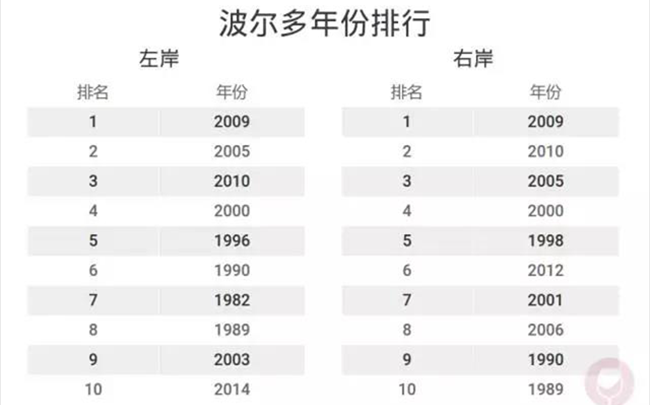 實際上,在波爾多的左岸和右岸地區(qū),同一年份的表現(xiàn)也略有不同(見下圖)。