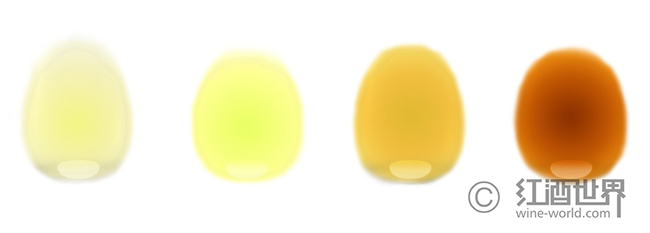 對(duì)于白葡萄酒來(lái)說(shuō),酒液中的單寧含量極少,因而在陳年時(shí)幾乎是一個(gè)純粹氧化的過(guò)程,顏色在這一過(guò)程中會(huì)逐漸變得深濃,由檸檬色或淺綠色轉(zhuǎn)為金黃色,繼而轉(zhuǎn)變?yōu)殓晟?/span>