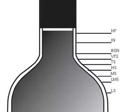 多指剛出廠時(shí)候的水位,一些新酒和陳年時(shí)間不長的葡萄酒的液面大都在這個位置。