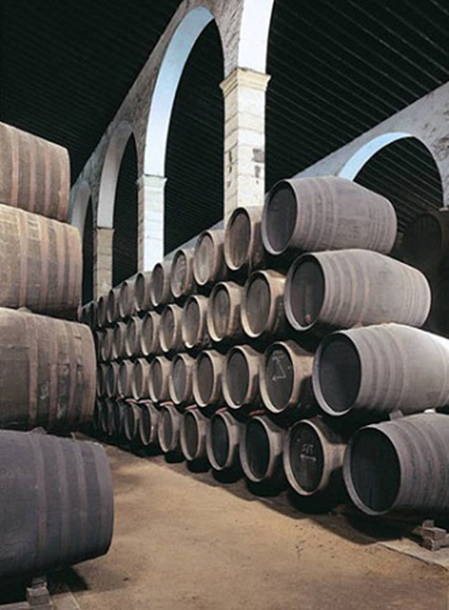 雪莉酒的強(qiáng)化發(fā)生在基酒發(fā)酵結(jié)束后,一般通過混入部分酒精濃度高達(dá)96%abv的蒸餾烈酒來將葡萄酒的酒精度提升至15-15.5%abv或17%abv。然后,酒液會轉(zhuǎn)入獨(dú)特的索萊拉(Solera)系統(tǒng)進(jìn)行熟化。這種系統(tǒng)的特點在于將不同熟化期的酒液分層存放,然后在熟成過程中每隔一段時間就將年輕酒液與熟化較久的酒液混合,以保證每次釀出的雪莉酒風(fēng)格一致,且品質(zhì)穩(wěn)定。雪莉酒的風(fēng)味大多源自該熟化階段,其風(fēng)格也與熟化時長和熟化方式等息息相關(guān)。