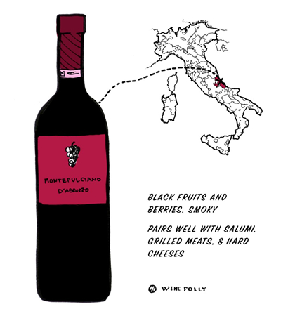 品質較高的蒙特布查諾葡萄酒顏色深邃,具有濃郁的黑色漿果氣息,單寧成熟且強勁,因此也常被用來與其他口感比較柔和的葡萄酒混釀。