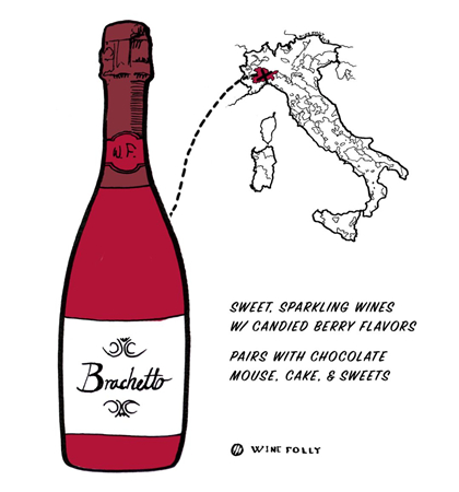 意大利出產的布拉凱多甜型起泡酒帶有玫瑰和清新的紅色水果香氣,口感清爽甜蜜,酒體輕盈,酒精度低,受歡迎程度堪比小甜水莫斯卡托阿斯蒂(Moscato d'Asti)。