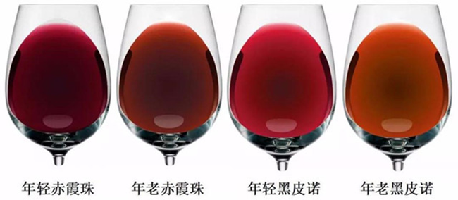 紅葡萄酒的單寧含量較多,在陳年的過程中,其鮮艷的顏色會越來越暗淡。紫色象征著年輕,如果酒體的中心顏色是紫紅色或寶石紅色,那么這款酒無疑是年輕的;而石榴紅色、橙紅色、琥珀色和紅茶色則代表著陳年。