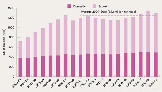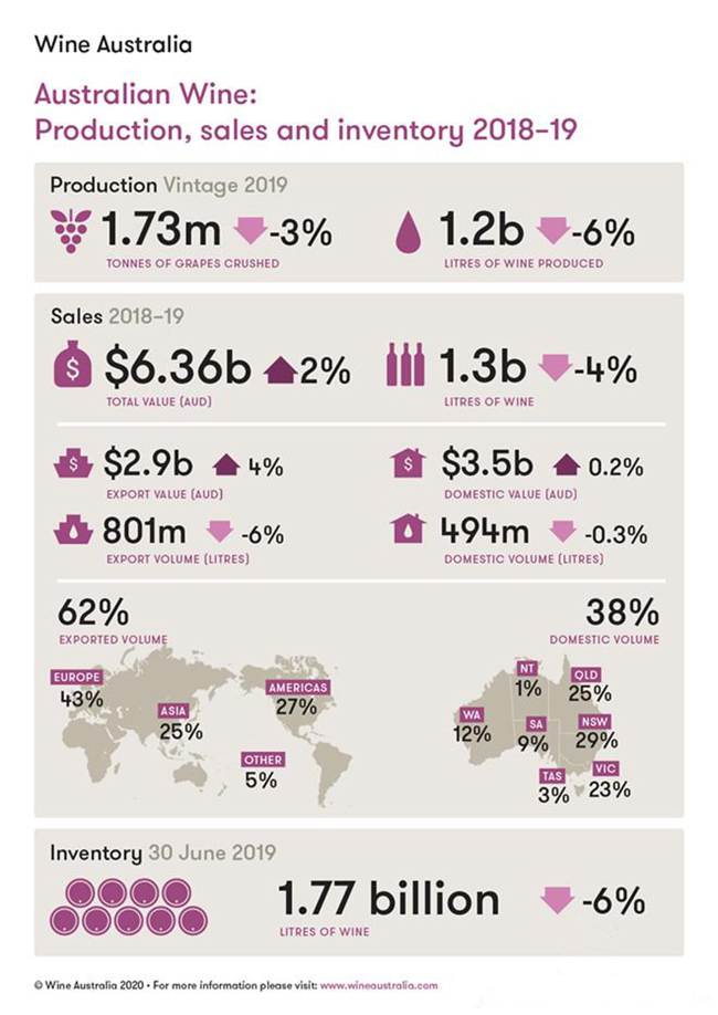 根據(jù)澳大利亞葡萄酒協(xié)會(Wine Australia)今天發(fā)布的《2019年葡萄酒生產銷售和庫存報告》顯示,澳洲葡萄酒總銷量連續(xù)第二年超過產量,這表明供應趨緊并提升了澳大利亞葡萄酒行業(yè)的價值。