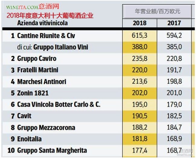 意大利雖然擁有超過(guò)10萬(wàn)家酒莊,但是95%以上的酒莊年產(chǎn)量都在10萬(wàn)瓶以下,即使是意大利排名前十大的企業(yè),除了GIV集團(tuán)年產(chǎn)值超過(guò)3億歐元,其余9家的產(chǎn)值都在2.5億歐元以內(nèi)。意大利的前十大公司經(jīng)營(yíng)規(guī)模和綜合實(shí)力,與法國(guó)(拉菲羅斯柴爾德和卡思黛樂(lè)集團(tuán)年產(chǎn)值均超10億美元)、澳大利亞(2019年富邑20億美元產(chǎn)值)、智利(干露超過(guò)10億美元)、美國(guó)(嘉露超過(guò)30億美元)的大型酒業(yè)集團(tuán)規(guī)模差距較大。從葡萄酒生產(chǎn)的規(guī)模衡量,和國(guó)際大型酒商相比,意大利葡萄酒產(chǎn)量最大的Caviro集團(tuán)年產(chǎn)量也只能排在全球第15位。