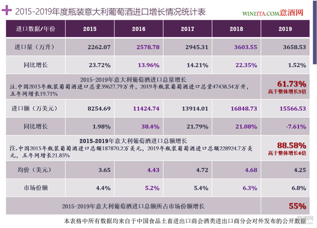為了方便業(yè)內(nèi)人士更好的理解意大利酒近五年來(lái)的成長(zhǎng),意酒網(wǎng)將2015-2019年中國(guó)進(jìn)口瓶裝葡萄酒統(tǒng)計(jì)數(shù)據(jù)重新整理,將五年來(lái)意大利葡萄酒的進(jìn)口量、進(jìn)口額、均價(jià)和市場(chǎng)份額進(jìn)行對(duì)比,得出上圖的2015-2019年度瓶裝意大利葡萄酒進(jìn)口增長(zhǎng)統(tǒng)計(jì)表。