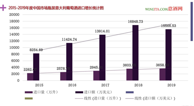 2019年度意大利瓶裝葡萄酒的進(jìn)口總量為3658 53萬(wàn)升,進(jìn)口總額為1 5566億美元,均價(jià)為4 25美元 升,占據(jù)的6 8%的市場(chǎng)份額。2015-2018年,中國(guó)市場(chǎng)瓶裝意大利葡萄酒進(jìn)口總額連續(xù)四年增長(zhǎng),只有2019年度相比2018年度下降7 61%。中國(guó)瓶裝葡萄酒進(jìn)口總量從2015年的39627 79萬(wàn)升,至2019年的47438 54萬(wàn)升,五年間增長(zhǎng)為19 71%。