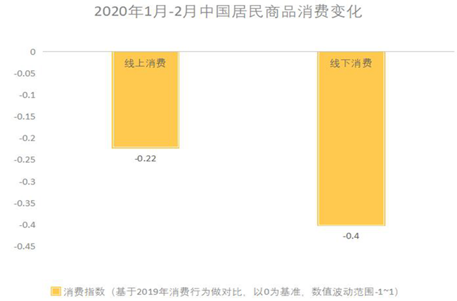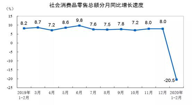 國(guó)內(nèi)自1月份開始受到疫情沖擊,生產(chǎn)消費(fèi)幾乎冰凍。1-2月份,社會(huì)消費(fèi)品零售總額52130億元,同比名義下降20.5%(扣除價(jià)格因素實(shí)際下降23.7%,以下除特殊說明外均為名義增長(zhǎng)),較去年12月大幅下滑28.5和28.2個(gè)百分點(diǎn),其中僅糧油食品、飲料、藥品等少數(shù)維持正增長(zhǎng)。(數(shù)據(jù)來源:國(guó)家統(tǒng)計(jì)局)