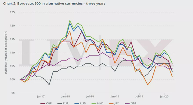 此外,波爾多500指數(shù)在過去12個月降低了3.6%,該指數(shù)追蹤二級市場上交易量最大的50款波爾多葡萄酒過去10年的價格走勢。過去一年,波爾多500指數(shù)使用英鎊的交易下跌3.6%,歐元下跌3.8%,美元下跌6.7%,日元下跌9.5%。