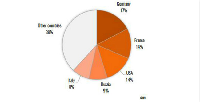 德國位列第三位,2018年的起泡葡萄酒產量2.8億升,略低于平均水平。起泡酒生產占到了總產量的28%,這一比例在所有起泡酒生產國中是最高的。