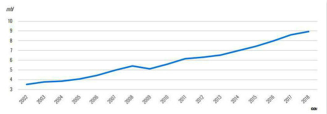 全球起泡葡萄酒消費變化趨勢(2002年-2018年)