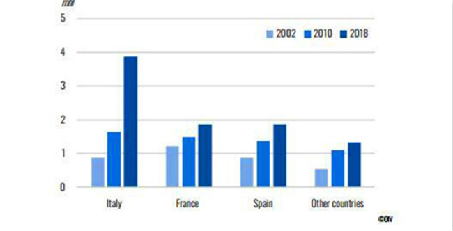 2018年,意大利起泡酒的出口量為3.9億升,占全球起泡酒出口市場的43%。主要出口市場為英國、美國、德國。出口值為15億歐元。