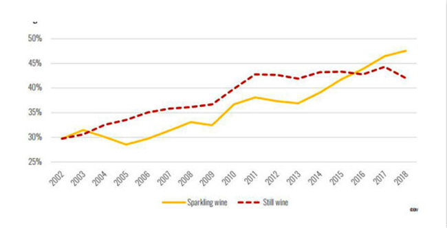 在過去,起泡葡萄酒的國際貿易少于靜止葡萄酒。但從2016年開始,這一趨勢發(fā)生了逆轉。2018年,起泡葡萄酒所占貿易份額為48%,而靜止酒為43%。