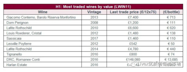 Giacomo Conterno, Barolo Riserva Monfortino 2013年成為上半年交易總值最高的葡萄酒。目前為止,意大利的交易份額為10.3%,而此酒則占了該酒區(qū)14.6%交易。2013年份(去年年底發(fā)布)取得Antonio Galloni (Vinous) 99分。2014年份(AG 100)于本月初上市。目前的出價為£8,400(760歐元 / 每瓶)。