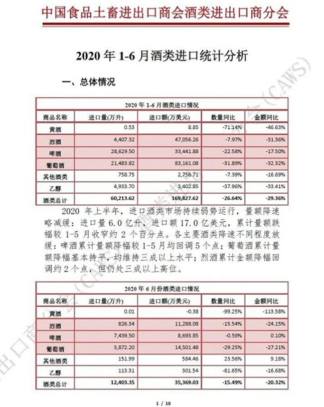 2020年上半年,進口酒類市場持續(xù)弱勢運行,量額降幅略減緩:進口量6.0億升,進口額17.0億美元,累計量額跌幅較1-5月收窄約2個百分點。其中,上半年葡萄酒進口量2.1億升,進口額8.3億美元,累計量額降幅維持三成以上水平,在酒類進口總額中占比下滑至49.9%。