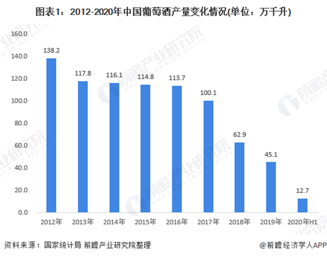 國家統(tǒng)計局?jǐn)?shù)據(jù)披露,2012-2019年,我國葡萄酒產(chǎn)量逐年下降。2019年,我國葡萄酒產(chǎn)量為4.51億升,較2018年下滑28.30%。2020年上半年,我國葡萄酒產(chǎn)量繼續(xù)走低,僅為1.27億升。
