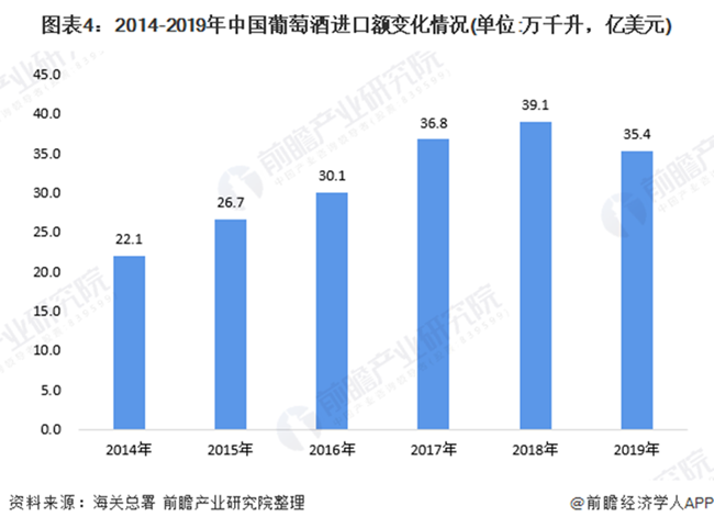 海關(guān)數(shù)據(jù)顯示,2019年,受行業(yè)景氣程度影響,我國葡萄酒進(jìn)出口額均有所下降,進(jìn)口額實(shí)現(xiàn)35.4億美元,出口額實(shí)現(xiàn)1.8億美元,進(jìn)口額跌幅高于出口額。整體進(jìn)出口總額降為37.2億美元,實(shí)現(xiàn)貿(mào)易逆差33.6億美元。