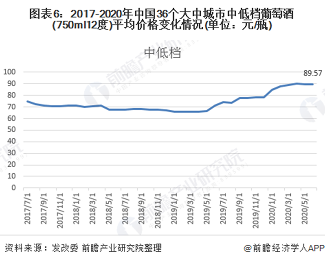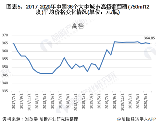 根據(jù)發(fā)改委披露的2017-2020年中國36個大中城市日用工業(yè)消費(fèi)品平均價格來看,2017-2020年我國葡萄酒價格整體上呈現(xiàn)先下降后增長的態(tài)勢。其中高檔葡萄酒價格波動幅度略高于中低檔葡萄酒。截至2020年6月,我國高檔葡萄酒平均價格為364.85元/瓶,中低檔葡萄酒平均價格為89.75元/瓶。