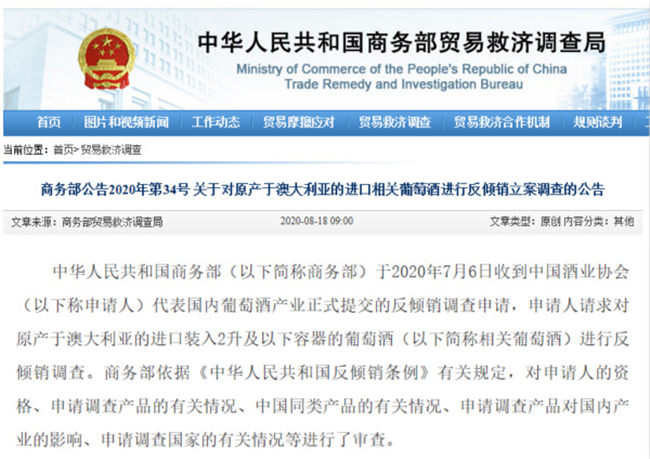 根據(jù)上述審查結(jié)果,依據(jù)《中華人民共和國反傾銷條例》第十六條的規(guī)定,商務(wù)部決定自2020年8月18日起對原產(chǎn)于澳大利亞的進(jìn)口相關(guān)葡萄酒進(jìn)行反傾銷立案調(diào)查。現(xiàn)將有關(guān)事項公告如下: