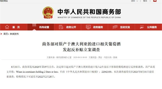 8月31日,商務(wù)部發(fā)布2020年第35號(hào)公告,決定即日起對(duì)原產(chǎn)于澳大利亞的進(jìn)口裝入2升及以下容器的葡萄酒進(jìn)行反補(bǔ)貼調(diào)查。該產(chǎn)品英文名稱:Wines in containers holding 2 liters or less,歸在《中華人民共和國(guó)進(jìn)出口稅則》:22042100。本次調(diào)查通常應(yīng)在2021年8月31日前結(jié)束調(diào)查,特殊情況下可延長(zhǎng)至2022年2月28日。