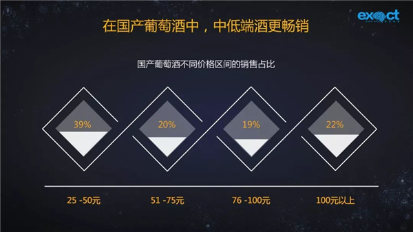 從消費(fèi)市場(chǎng)來看,國產(chǎn)葡萄酒銷量占比最大的價(jià)格區(qū)間集中在25-50元,其次是51-75元、76-100元。單價(jià)100元以內(nèi)的占據(jù)國產(chǎn)葡萄酒市場(chǎng)近八成。