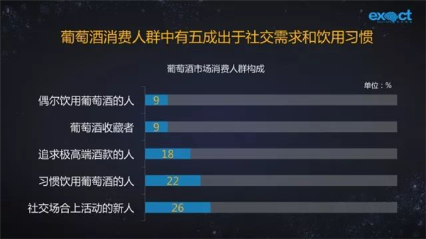 消費(fèi)者人群的構(gòu)成當(dāng)中,剛開始在社交場(chǎng)合上活動(dòng)的新人,和正逐漸形成葡萄酒飲用習(xí)慣的人群幾乎占據(jù)了整個(gè)人群的半壁江山。