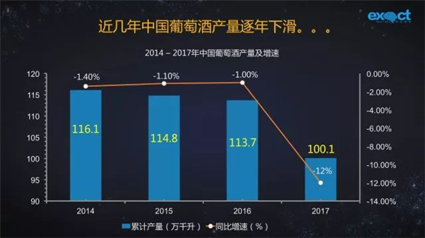 從統(tǒng)計(jì)數(shù)據(jù)看,2014-2017年,中國葡萄酒產(chǎn)量呈逐年下滑態(tài)勢(shì)。2017年中國葡萄酒產(chǎn)量為100.1萬千升,同比下滑12%。據(jù)業(yè)內(nèi)人士認(rèn)為,中國葡萄酒正處于調(diào)整優(yōu)化期,劣質(zhì)產(chǎn)能下滑,優(yōu)質(zhì)產(chǎn)能上升。一方面,進(jìn)口品牌對(duì)中國葡萄酒產(chǎn)業(yè)造成巨大沖擊;另一方面,低端低價(jià)競(jìng)爭(zhēng)把國產(chǎn)葡萄酒逼入死胡同。