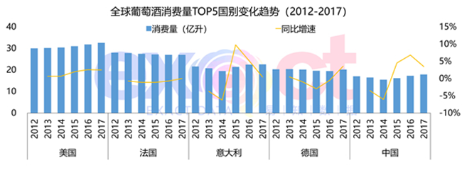 報(bào)告顯示,從2015年開始,中國葡萄酒消費(fèi)量持續(xù)增加,且增速保持在3.5%-6.8%。2017年,中國葡萄酒消費(fèi)量增加了0.6億升,全球占比7%,相比其他國家市場空間更大。