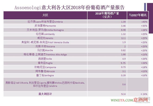 11月中旬,隨著意大利全境葡萄采摘季結(jié)束,意大利釀酒師及釀酒技術(shù)協(xié)會(huì)(Assoenologi)公布了關(guān)于2018年份意大利葡萄酒的產(chǎn)量報(bào)告。基于意大利農(nóng)業(yè)部的官方數(shù)據(jù),該報(bào)告做出結(jié)論:2018年,意大利葡萄酒及葡萄汁產(chǎn)量將比2017年份增長(zhǎng)24%,將達(dá)到52.6億升。今年意大利葡萄酒產(chǎn)量的實(shí)際增幅超越了8月末曾發(fā)布的產(chǎn)量預(yù)告,整體形勢(shì)較為樂(lè)觀。