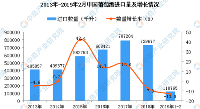 據(jù)中商產(chǎn)業(yè)研究院數(shù)據(jù)庫顯示,2013年-2017年中國葡萄酒進(jìn)口量增長,共增長381347千升,增長93.96%;2018年中國葡萄酒進(jìn)口量回落,2019年1-2月中國葡萄酒進(jìn)口量為118765千升,同比下降13%。