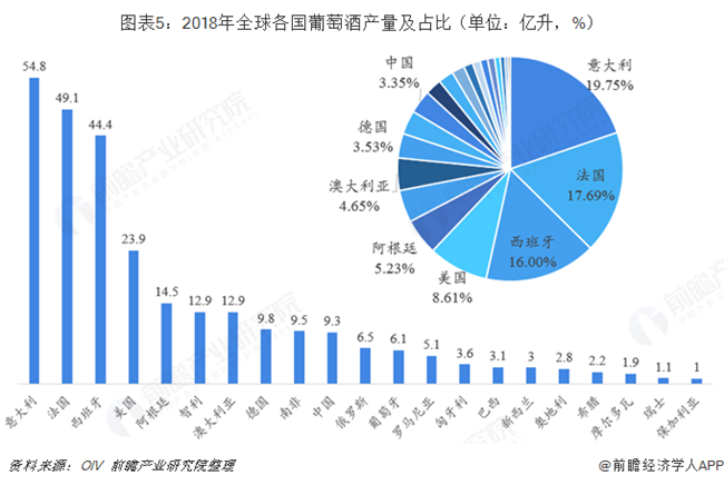 2018年,歐洲依然是全球最大的葡萄酒生產(chǎn)區(qū)域,總產(chǎn)量實(shí)現(xiàn)181.9億升,占比高達(dá)62%。世界排名前三的葡萄酒生產(chǎn)國依次是意大利(54.8億升)、法國(49.1億升)和西班牙(44.4億升),三者的產(chǎn)量總和超過了世界總產(chǎn)量的一半,達(dá)到51%。根據(jù)OIV的統(tǒng)計口徑,2018年中國葡萄酒產(chǎn)量為9.3億升,排名世界第十,全球占比3.35%。
