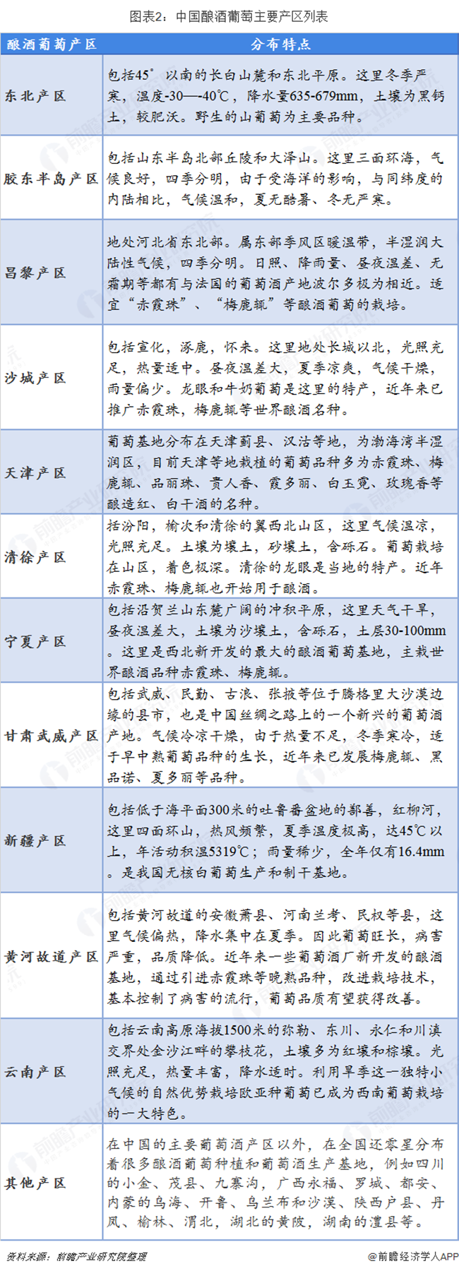 目前國內(nèi)主要的釀酒葡萄產(chǎn)區(qū)分布在華北地區(qū)、沿海一帶、新疆、甘肅等地,大面積的種植滿足了中國的葡萄酒產(chǎn)業(yè)基本的原料需求。釀酒葡萄一般分為白葡萄和紅葡萄兩種,這兩種葡萄更適合沿海地區(qū)的種植。釀酒葡萄一般在九月份成熟,因?yàn)閷λ忠筝^大,所以不適合西部地區(qū)東北地區(qū)種植,可以做鮮食,但不適合存儲。在中國北緯45°-25°廣闊的地域里,分布著各具特色的葡萄、葡萄酒產(chǎn)地。葡萄酒行業(yè)經(jīng)過多年的發(fā)展,逐步形成11個具有典型產(chǎn)地特征葡萄酒產(chǎn)區(qū)。