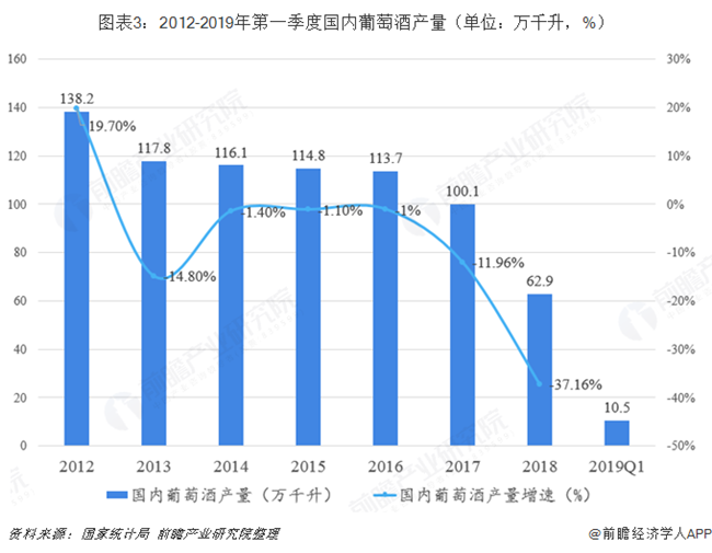 近幾年由于我國實(shí)行“三公”政策對葡萄酒行業(yè)發(fā)展造成一定負(fù)面影響,葡萄酒行業(yè)一直處于產(chǎn)業(yè)結(jié)構(gòu)調(diào)整時期。從國家統(tǒng)計局的數(shù)據(jù)看來,2012年我國葡萄酒產(chǎn)量一直處于下跌狀態(tài),2018年全國葡萄酒產(chǎn)量累計值為62.9萬千升,比2017年總產(chǎn)量的100.1萬千升減少了37.2萬千升,暴跌37.16%。