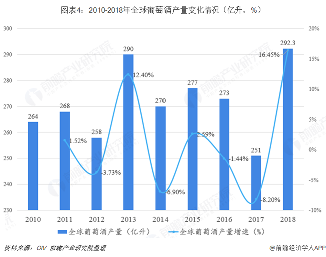 放眼世界,2019年4月國際葡萄酒權(quán)威機(jī)構(gòu)OIV(國際葡萄與葡萄酒組織)發(fā)布了2018年全球葡萄酒的有關(guān)數(shù)據(jù)。數(shù)據(jù)顯示,2018年全球葡萄酒(不包括葡萄汁和酒醪)產(chǎn)量達(dá)到292.3億升,創(chuàng)15年來最高值。相對于2017年的251億升,產(chǎn)量增加了41.3億升。由于惡劣天氣的原因,2017年全球葡萄酒產(chǎn)量下降8.2%,是近50年來最低值。