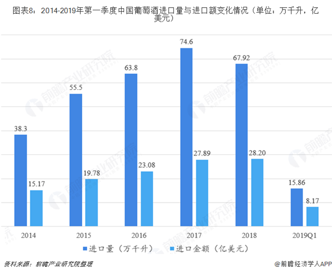 2019年1-3月,中國累計進(jìn)口葡萄酒15.86萬千升,同比下降24.3%;金額為8.17億元,同比下降15.8%。
