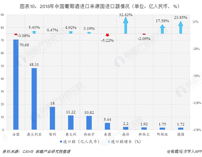 根據(jù)中國葡萄酒及烈酒進(jìn)出口協(xié)會(CAWS)發(fā)布的2018年中國進(jìn)口葡萄酒數(shù)據(jù)報告,2018年法國、澳大利亞和智利為我國葡萄酒三大進(jìn)口來源國。其中法國葡萄酒進(jìn)口量達(dá)1.74億升,同比下降21.06%;進(jìn)口金額70.68億人民幣,同比下降3.08%。盡管法國進(jìn)口量和進(jìn)口額均較上年有所下降,與第二名澳大利亞的差距逐漸縮小,但其在中國進(jìn)口葡萄酒市場上的地位依舊排名第一。