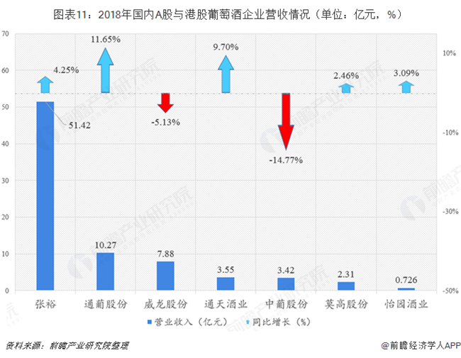 2018年七家葡萄酒企業(yè)的營業(yè)收入總和達(dá)到近80億元,其中只有威龍股份和中葡股份兩家企業(yè)營收出現(xiàn)下跌。張裕在2018年實(shí)現(xiàn)營收51.42億元,同比增長4.25%,行業(yè)龍頭位置穩(wěn)固;通葡股份營收增速最高,達(dá)11.65%,營收10.27億元達(dá)到上市以來新高;中葡股份下滑幅度最大,2018年營收實(shí)現(xiàn)3.42億元,同比下滑14.77%,連續(xù)兩年虧損的中葡股份股票實(shí)施退市風(fēng)險,股票簡稱由“中葡股份”變?yōu)?ldquo;*ST中葡”。
