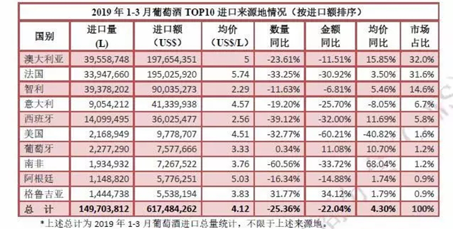 數(shù)據(jù)是反映市場的晴雨表。2013~2018年上半年我國葡萄酒的進(jìn)口量逐年遞增,2018年上半年,我國葡萄酒進(jìn)口量為38.54萬千升,同比增長25.8%。但從下半年開始,局勢發(fā)生逆轉(zhuǎn),最終,2018年度葡萄酒以68.75億升的進(jìn)口量收尾,同比下降8.26%,從上面的數(shù)據(jù)分析可知,2019年一季度下滑態(tài)勢仍未扭轉(zhuǎn)。