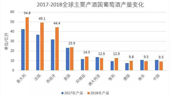 據(jù)OIV數(shù)據(jù)顯示,2018年全球葡萄酒產(chǎn)量292.3億升,較2017年增加了17%。排名前十的國家分別是:意大利54.8億升、法國49.1億升、西班牙44.4億升、美國23.9億升、阿根廷14.5億升、智利12.9億升、澳大利亞12.9億升、德國9.8億升、南非9.5億升、中國9.3億升。