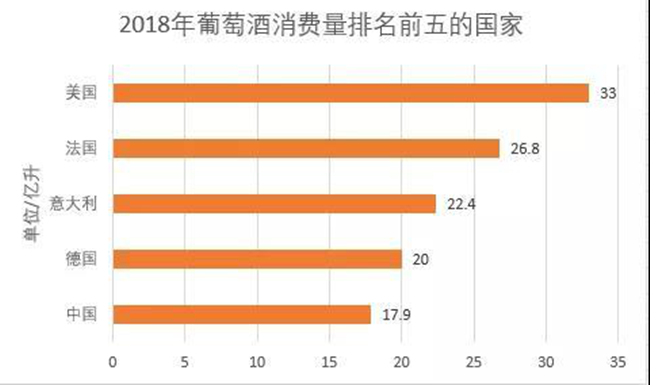 從葡萄酒消費量來看,2018年全球葡萄酒消費量246億升,基本與上一年持平。從各國情況來看,美國仍然是全球最大的葡萄酒消費國,消費量為33億升。其次是法國(26.8億升)、意大利(22.4億升)、德國(20億升),中國以17.9億升位居第五。