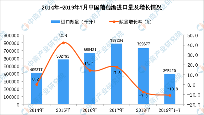 據(jù)中商產業(yè)研究院數(shù)據(jù)庫顯示,2019年1-2季度中國葡萄酒進口量有所增長,2019年1-7月中國葡萄酒進口量為395429千升,同比下降10.8%。