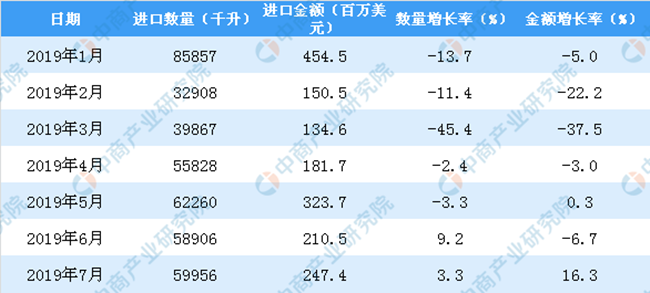 2019年1-7月中國葡萄酒進口數(shù)量及金額增長率情況