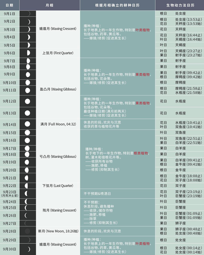 生物動力歷法以月亮的運行軌跡為基礎建立。月球每月都會先后經過黃道帶上的12個星座,12星座的又分為土象、風象、火象和水象星座,而這四大星象又分別對應植物不同的部位:土——根,水——葉,風——花,火——果,生物動力歷法就是根據月亮進入不同的星座對農事進行指導。比如,當月亮運行至土象星座,則是根日,宜對胡蘿卜之類的根莖類作物進行播種、移植或培育;當月亮運行至水象星座,則是葉日,則宜管理葉類植物;火象星座對應果日,適宜對果類(比如葡萄樹)或者種子類作物進行管理;如果要種植或采收花卉,那么待月亮運行到風象星座,即花日,時機最佳。