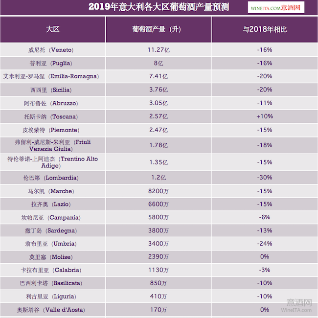 根據目前的預測,在所有大區中,2019年份葡萄酒產量最高的將是威尼托(Veneto)大區,預計達到11.2億升,將比2018年減少16%。第二、第三位依次是普利亞(Puglia)大區和艾米利亞-羅馬涅(Emilia-Romagna)大區,葡萄酒產量預計分別將達到8億升和7.41億升。